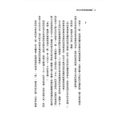 此時新聞畫面一轉,播報起另一則黑道尋仇的消息,被砍殺的黑道少年送醫急救,地上留下凌亂的鮮血殘跡,從主播的語氣聽得出隱藏的不屑態度,吳廷岡凝視了一會兒,也替自己倒了一杯啤酒。