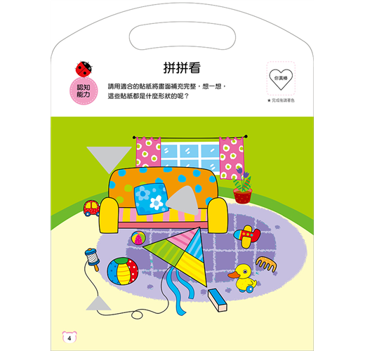2. 透過好玩的貼貼紙遊戲搭配不同的題目類別,刺激孩子腦部多元發展,提高寶貝們的觀察能力、認知能力、繪畫能力、創造能力、想像能力、推斷能力、數學能力。