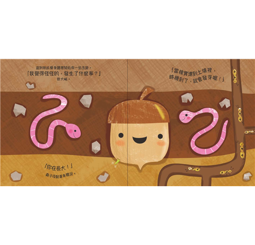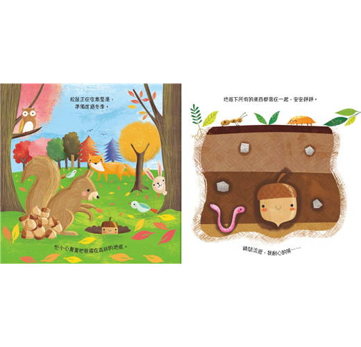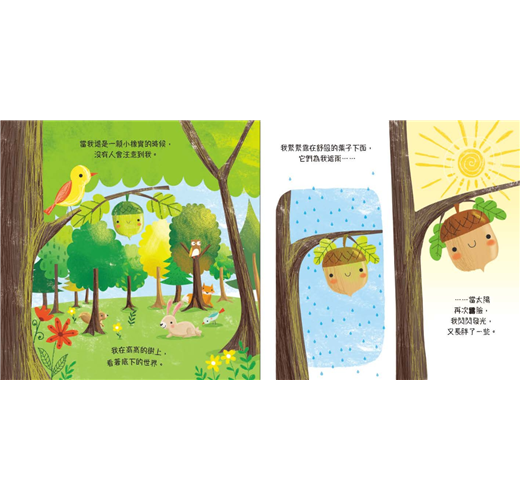 ◆隨著季節變換,小橡實長成大樹再結成小橡實,可愛有趣的小橡實及各種貼近生活的動植物對話,使得故事更加生動有趣,也讓孩子更容易理解樹的生命循環。