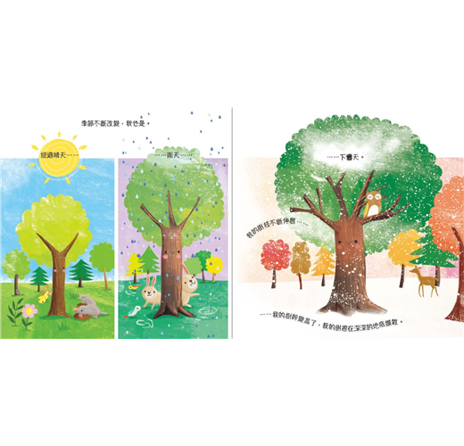經過晴天、雨天、下雪天,小橡實長出了樹枝、樹幹,樹根也深深的地底擴散。鳥兒在它粗壯的樹枝上築巢,蜘蛛織了黏黏的網子,甲蟲也在這裡小跑步,松鼠調皮的四處竄。