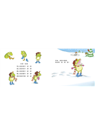 他穿上襪子——咻咻!套上靴子——噗噗!戴上帽子——啪搭!圍上他的圍巾——嘶嚕!戴好手套——啵啵!然後,跳到外面的雪地裡,跳、跳、跳。