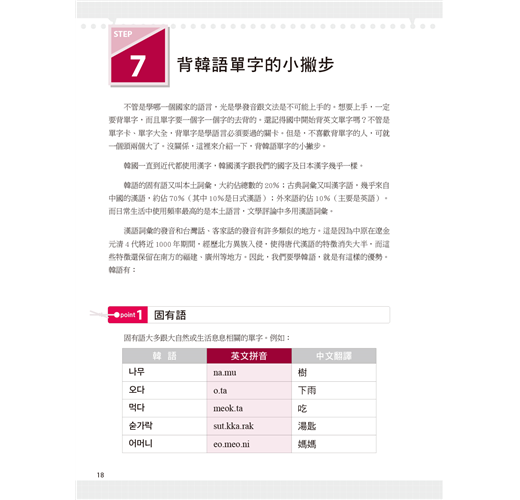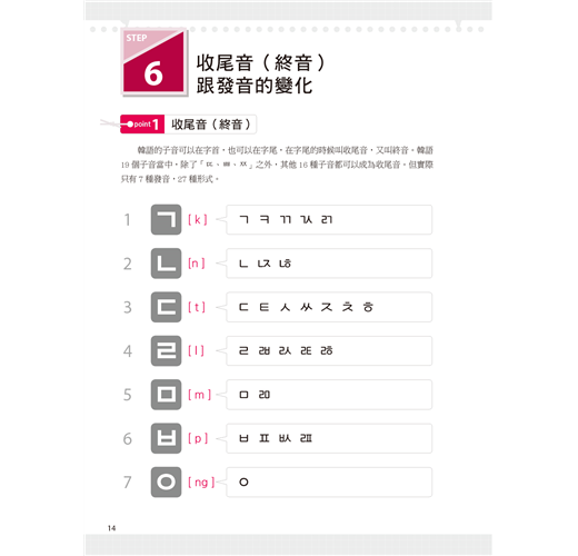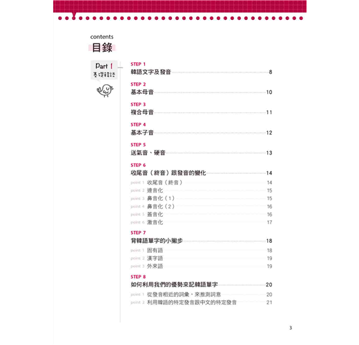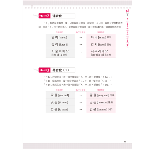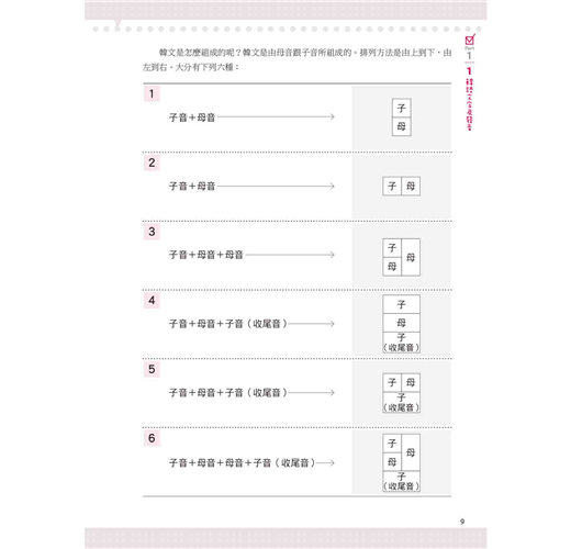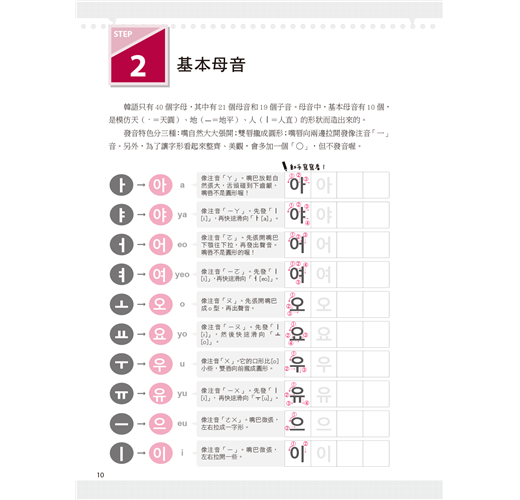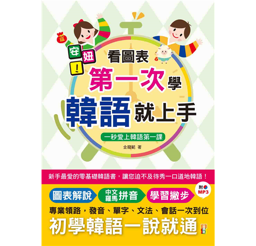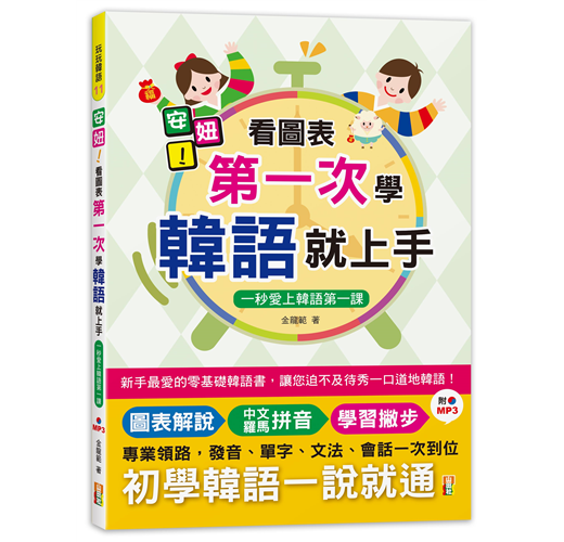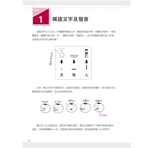 韓語的母音有圈、有線、有點,這是根據中國天地人思想而來的:圈圈「ㅇ」代表太陽(天),橫線「ㅡ」代表地,直線「l」是人;子音則是模仿發音時的口型所創造出來,很多發音都可以和我們使用的注音相對照。本書透過生動活潑的圖像與文字讓您秒懂韓語子音、母音,還有實際演練,讓您動手寫寫看,增加記憶強度!最後還有韓語單字小撇步,教您如何利用中文母語者的優勢,將韓語單字一網打盡,記憶不漏勾!