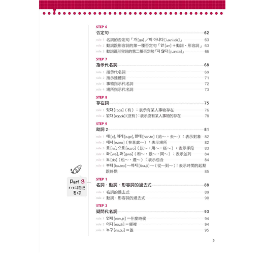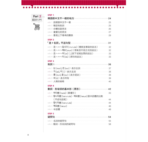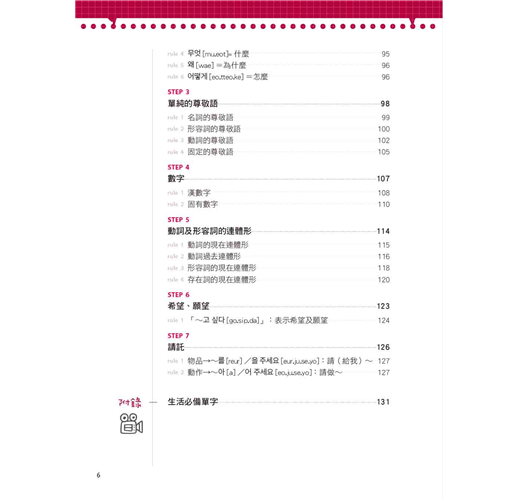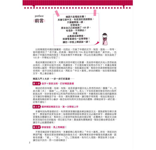本書特別為零基礎的您,利用簡潔易懂的圖表解說韓語文法,重點都幫您標示清楚了,學習當然就更有效率!每個章節開頭都有學習文法必備的單字,還歸納出學習重點及關鍵文法,幫助您二次復習時能夠迅速回復記憶,反覆幾次,韓語文法絕對深深烙印在您的腦海,想忘都忘不掉!最後還有實戰練習,幫助您驗收學習成果,讓您不止能讀還會寫!