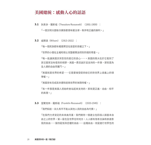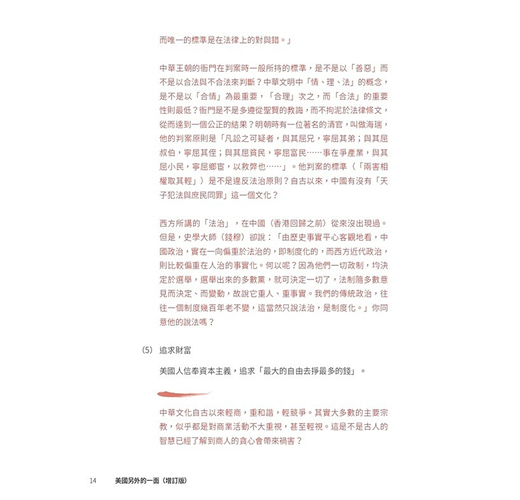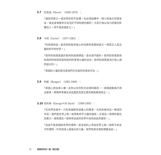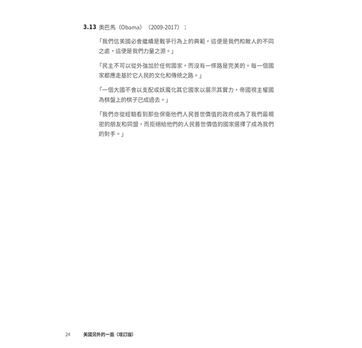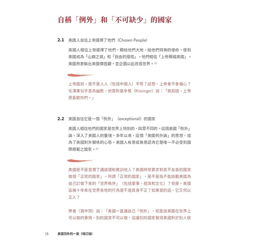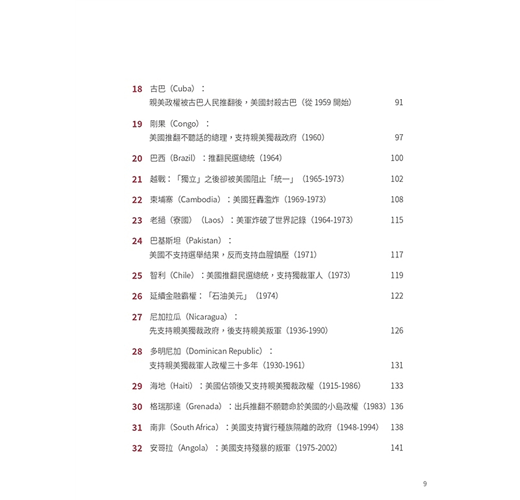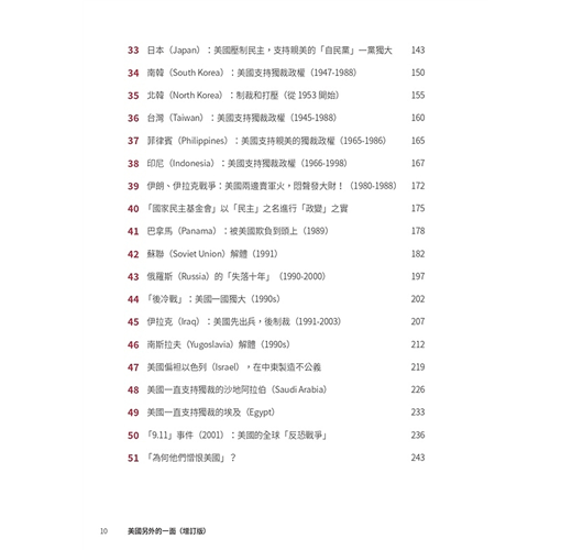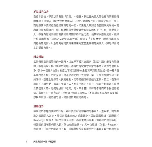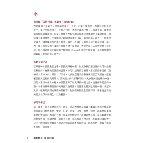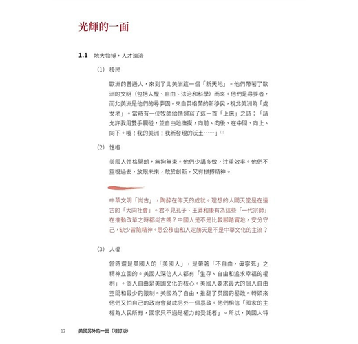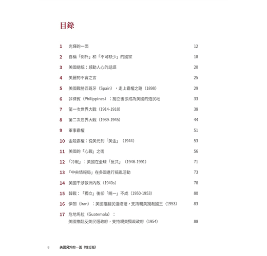 ˙美國光輝的一面,對大多數英語世界的人可以說是耳熟能詳。有關美國正面的書籍,亦可以說是俯拾皆是。本書無意平衡美國的光輝面與陰暗面,而是聚焦於其陰暗的一面,希望令大家(在熟悉美國光輝面的前提下)對美國有比較全面的認識,不會在主流的美國文化下以偏概全、以點蓋面。