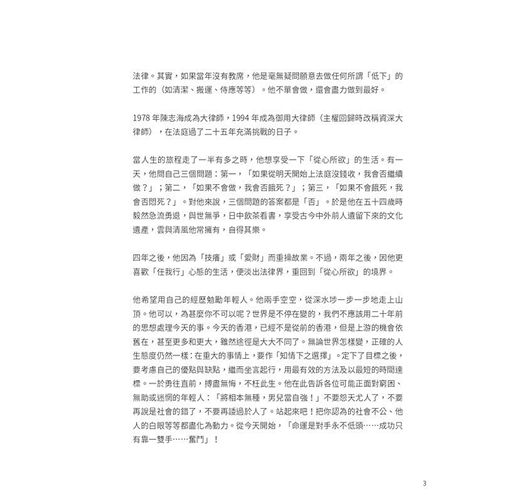 他希望用自己的經歷勉勵年輕人。他兩手空空,從深水埗一步一步地走上山頂。他可以,為甚麼你不可以呢?世界是不停在變的,我們不應該用二十年前的思想處理今天的事。今天的香港,已經不是從前的香港,但是上游的機會依舊在,甚至更多和更大,雖然途徑是大大不同了。無論世界怎樣變,正確的人生態度仍然一樣:在重大的事情上,要作「知情下之選擇」。定下了目標之後,要考慮自己的優點與缺點,繼而坐言起行,用最有效的方法及以最短的時間達標。一於勇往直前,搏盡無悔,不枉此生。他在此告訴各位可能正面對窮困、無助或迷惘的年輕人:「將相本無種,男兒當自強!」不要怨天尤人了,不要再說是社會的錯了,不要再諉過於人了。站起來吧!把你認為的社會不公、他人的白眼等等都盡化為動力。從今天開始,「命運是對手永不低頭……成功只有靠一雙手……奮鬥」!