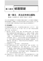 民法五編依照「總則」、「債編」、「物權」、「親屬」、「繼承」分別以焦點說明,給各位該編完整的體系架構,其次的「實戰演練」遴選最具代表性的測驗題型以及申論題型給各位做練習,考題深度及廣度兼具,並且輔以圖示及解析,希望能夠加深你的記憶,以便在考場上能夠針對所學的概念靈活運用,以獲得高分!