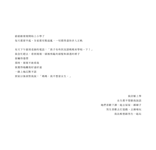 2. 故事內容跨越探索期、青春期、同儕相處等階段,闡述跨性別者自身心境,以及跨性別孩子的母親所見而產生的想法。