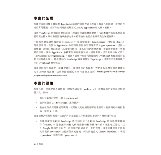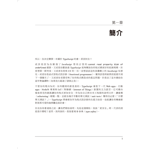 如果你是具有中等JavaScript經驗的程式設計師,作者Boris Cherny會教授你如何精通TypeScript語言。你會學到TypeScript如何能幫助你消除程式碼中的臭蟲,並讓你更輕易將程式碼的規模拓展,讓更多工程師維護。