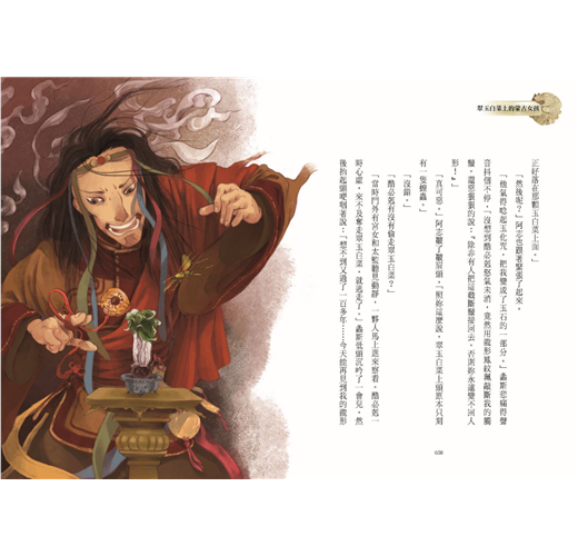 第一集登場的文物,是故宮人氣第一名的「翠玉白菜」。作者將奇幻的焦點,對準了翠玉白菜上斷了觸鬚的螽斯,把牠變成受了魔法禁錮的蒙古格格。這大膽的想像,不但切中文物特徵,也拉出了奇幻線頭。於是,在故宮裡,時空奇妙的「跨海峽」連結起來了。此刻暫停,歷史鮮活來前,一趟有趣的清朝後宮生活祕史,就此展開。