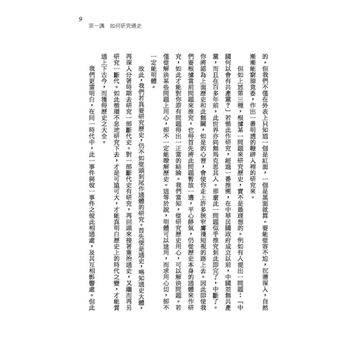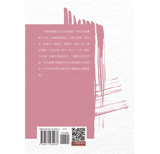 本書根據賓四先生於民國五十年在香港講演之內容,記載修整而成。內容分通史、政治史、社會史、經濟史、學術史、歷史人物、歷史地理、文化史等八部分。此下三十年,賓四先生個人有關史學諸著作,大體意見悉本於此,故本書實可謂賓四先生史學見解之本源所在,亦可視為其對中國史學大綱要義之簡要敘述。