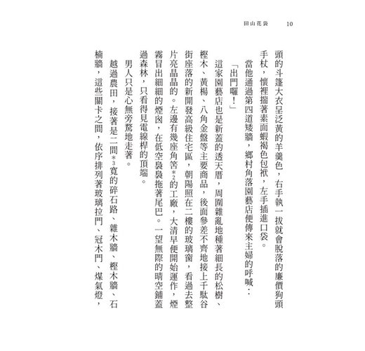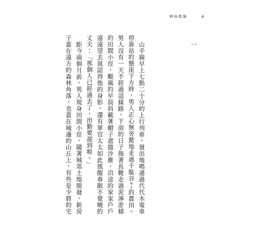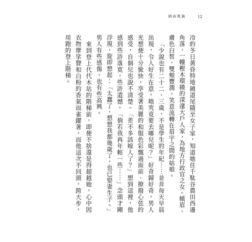 「時雄沿著河堤走,腦中千頭萬緒。比起芳子的無情,他更痛恨自己的家庭如此淒涼。三十五、六歲的男女最常面臨的生活愁苦、事業上的煩惱,以及性慾上的不滿足,種種現況壓迫著他的身心。芳子是他乏善可陳的生活中綻放的一枝花朵,是他的精神糧食。有了芳子的美作為動力,他荒蕪的心田終於再次開出花朵,生鏽多時的鐘終於再次敲響。因為芳子,他才能重振旗鼓,如今卻得被迫回到從前那種寂寞荒涼的尋常生活……。」
