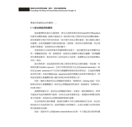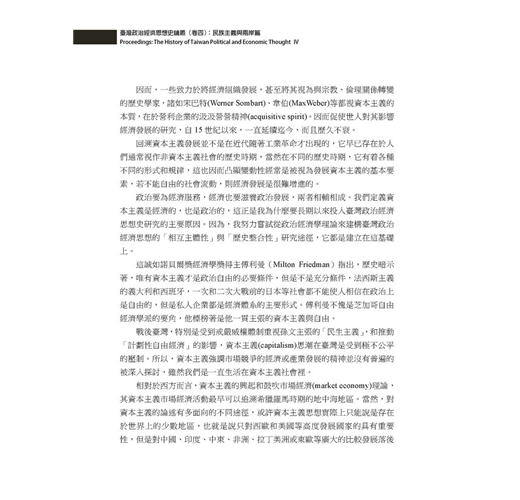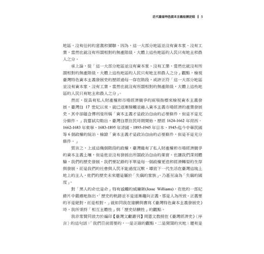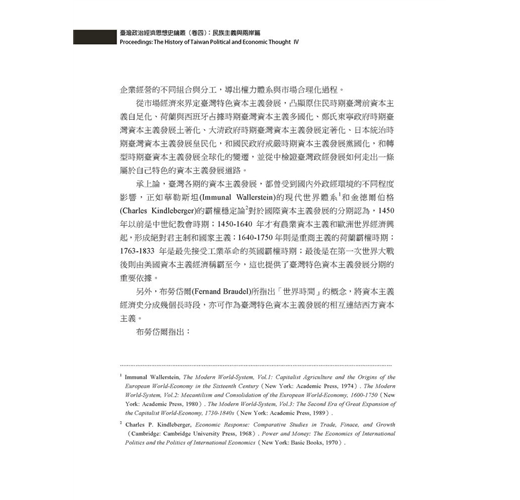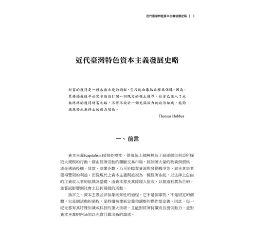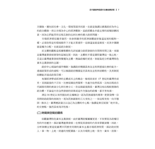 或許讀者有機會對照閱讀的話,當可發覺我已經把許多有關資本主義和政治經濟學的概念,融入原本我純粹就臺灣經濟政策與發展的內容,做了大幅度的增修。我深盼讀者在閱讀過〈近代臺灣特色資本主義發展史略〉之後,能比較有系統地幫助大家對於近代臺灣政治經濟思想史領域的了解。