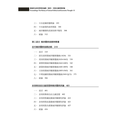 本書第三部分「兩岸關係發展與變遷」共所收錄有:〈近代兩岸關係發展史略〉與〈余英時自由主義思想與兩岸關係評論〉二文。