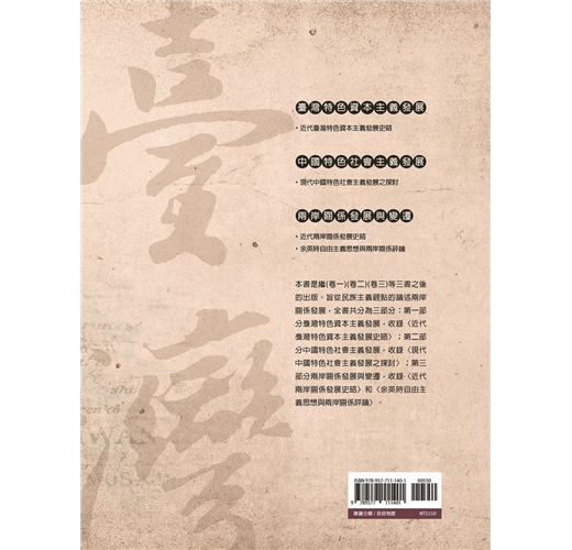 本書是繼(卷一)(卷二)(卷三)等三書之後的出版。旨從民族主義觀點的論述兩岸關係發展,全書共分為三部分:第一部分臺灣特色資本主義發展,收錄〈近代臺灣特色資本主義發展史略〉;第二部分中國特色社會主義發展,收錄〈現代中國特色社會主義發展之探討〉;第三部分兩岸關係發展與變遷,收錄〈近代兩岸關係發展史略〉和〈余英時自由主義思想與兩岸關係評論〉。