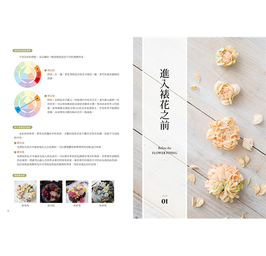介紹色彩基本的調色原理,如:紅加黃會產生橘色;以及介紹相似色、對比色等配色原理,讓操作者能理解基本的色彩概念,更能掌握在配置裱花時,要如何讓整體作品達到平衡!