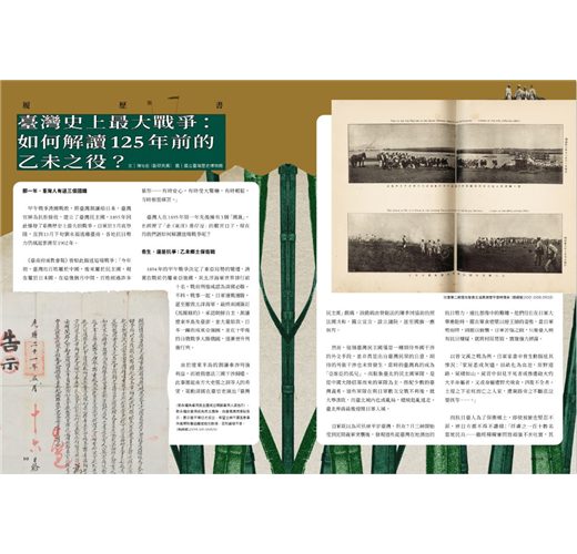本期《觀‧臺灣》以12篇專文、不同角度剖析這場「臺灣史上最大戰爭」,圖解乙未之役戰場及推進時間軸,並收錄大量當時浮世繪及戰地照片與書信等第一手資料。精選文章如下:
