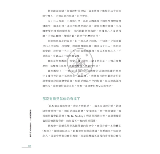 透過本書中二十個故事,我們可以細味充滿感情的文字,以領略嶺上人昔日的生活;細看已經發黃的照片,以重現調景嶺昔日的風貌。