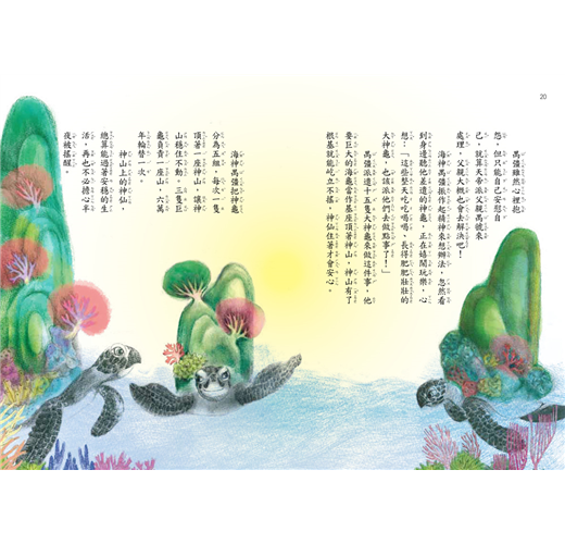 海神禺彊振作起精神來想辦法,忽然看到身邊聽他差遣的神龜,正在嬉鬧玩樂,心想:「這些整天吃吃喝喝、長得肥肥壯壯的大神龜,也該派他們去做點事了!」