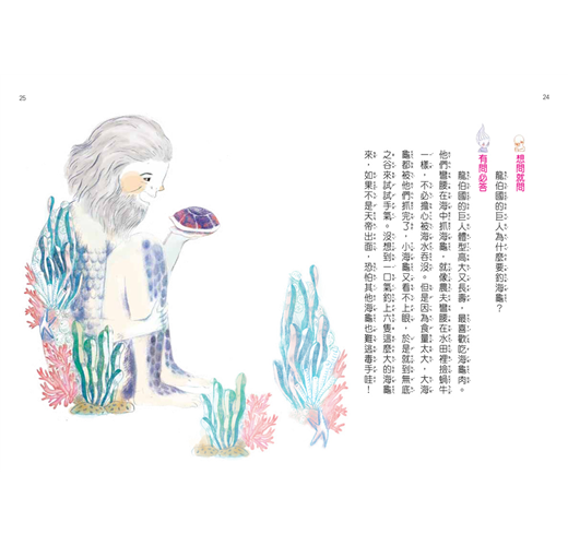 這一釣不得了,一口氣釣上六隻大海龜,巨人開開心心的提著海龜走回龍伯國。