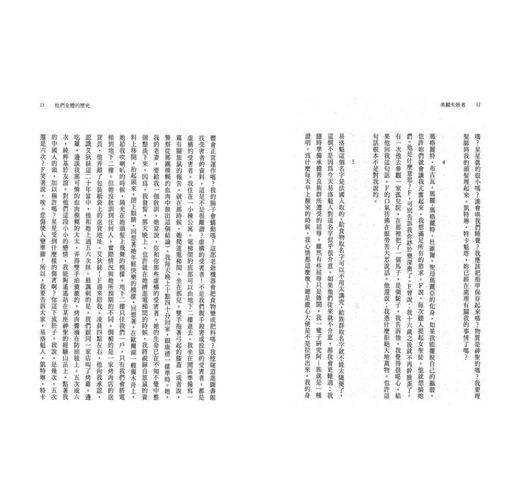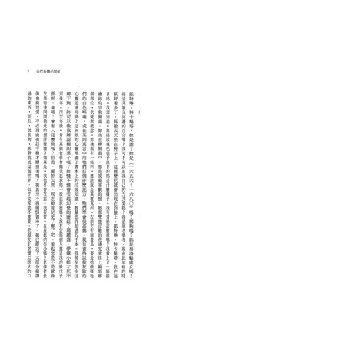 易洛魁這個名字是法國人取的。給食物取名字可以不用太講究,給族群取名字就不能太隨便了,這倒不是因為今天易洛魁人對這名字似乎很介意。如果他們從來就不介意,那我會更難過:我隨時準備承擔善良族群所遭受的屈辱,雖然有些屈辱只是傳聞,我一輩子研究阿—族就是一種證明。為什麼每天早上醒來的時候,我心情都這麼壞?總是擔心大便是不是拉得出來。我的身體會正常運作嗎?我的腸子會蠕動嗎?這部老爺機器會把食物變成肥料嗎?我挖隧道進圖書館找受害者的資料,這是不是很離譜?虛構的受害者!不是我們親手殺害或投獄的受害者,都是虛構的受害者。我住在一小棟公寓。電梯間的底部可以由地下二樓進去。我坐在鬧區準備寫一篇有關旅鼠的報告,就在那時候,她爬進電梯間,坐在那兒,雙手抱著弓起的膝蓋 (或者說,警察從那團模糊的血肉中做出這個結論)。我每天晚上十點四十分回家,跟康德一樣準時。她,我的老妻,要給我一個教訓。她常說,你和你那些虛構的受害者。她的生命已在不知不覺中整個黯淡下來,因為,我發誓,那天晚上,也許就在她擠進電梯間的時候,我將視線自旅鼠的資料上移開,抬起頭來,閉上眼睛,回想著她年輕快樂的模樣,回想著,在歐爾湖一艘獨木舟上,她給我吹喇叭的時候,陽光在她頭髮上飛舞的模樣。地下二樓只住我們一戶,只有我們會搭電梯到地下二樓。但她沒教訓到任何人,實際情況與她所預期的不同。倒楣的是一家烤肉店的送貨員,他弄錯了包裝紙袋上的送貨地址。艾狄絲!F過來陪我。凌晨四點左右,他向我承認,認識艾狄絲這二十年當中,他和她上過五六次床。最諷刺的是,我們跟同一家店叫了烤雞,邊吃雞,邊談我那可憐的血肉模糊的太太,弄得雙手油漉漉的,烤肉醬滴在防油毯上。五次或六次,純粹基於友誼。對他們這段小小的戀情,我能夠遙遙站在某座神聖的經驗山岳上,點著我的中國人的頭,加以稱許嗎?星星受到什麼樣的傷害啊?你這下流胚子,我說,是幾次,五次還是六次?F笑著說,唉,悲傷使人變準確!所以,我要告訴大家,易洛魁人,凱特琳.特卡魁塔的同胞,之所以被稱為易洛魁人,是因為法國人給他們取了這個名字。他們自稱霍得諾索尼人,意思是居住於長屋的人。他們已經發展出一種新的交談方式。他們在每一段話結束的時候加上「易洛」這兩個字,意思是:就像我所說的。如此一來,在哼哼哈哈的閒談場面中,如果有人突然想表示點什麼意見,他就可以為自己所說的話完全負責。在易洛後面,他們加上「魁也」這兩個字,一種快樂或痛苦的叫聲,就看那是吟唱聲或嚎叫聲。他們試圖以這種方法來穿透交談者之間那道神秘的帷幕,也就是說,話頭告一個段落,說話者就退回一步,然後試圖對聆聽者解釋他所說的話,試圖以真正的感情去顛覆會誤導人的理解力。凱特琳.特卡魁塔,請妳用易洛魁也的方式跟我說話。我沒有權利去管耶穌會的人對奴隸說什麼,但是,在我所企盼的那個聖勞倫斯河畔寒夜,當我們緊緊裹在我們的樺木火箭裡頭,肉體貼著靈魂,而我問妳我的老問題,說,星星真的很小嗎,啊,凱特琳.特卡魁塔,請以易洛魁也的方式回答我。那天晚上F和我吵了好幾個鐘頭。我們不知道天是什麼時候亮的,因為那間陰森的房子唯一的一扇窗對著通風管。