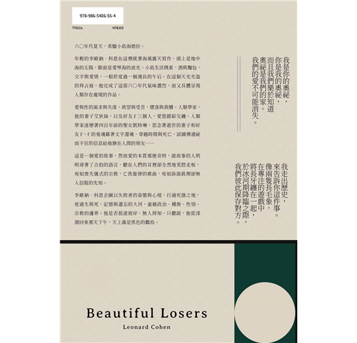 歌手科恩,是最容易被認識、最快被瞭解的身分;詩人科恩,是科恩最早進入的創作領域,也是他獲取桂冠榮譽的憑藉;小說家科恩,則是他最不被領略,讀者也最不知如何欣賞的身分,可也是科恩融合他在各種領域創作精神的試煉場。2003年,《美麗失敗者》的中文版,在英文版出版三十七年後終於面市,而科恩已經準備邁入七十大壽了。對於《美麗失敗者》被譯成中文出版,科恩當年也感到欣喜,畢竟他自己曾研究過中國的詩歌和禪學。不過他也坦然地說,讀者在閱讀《美麗失敗者》時的態度不宜太嚴肅,就連英文版讀者也一樣,否則這會是一本很難閱讀的書。科恩建議讀者隨意翻看,遇到不喜歡的地方就跳過去,說不定會有某些段落會引發讀者的好奇心。因為這本書是在希臘的海島上,無遮蔽的大太陽下寫成的,所以科恩說:「在你手中的不是一本書,而是一種中暑的症狀。」