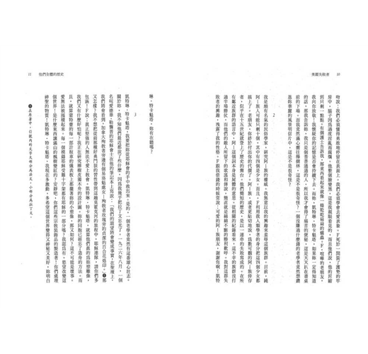 我是頗有名氣的民俗學家,研究阿—族的權威。我無意以我的興趣來羞辱這個族群。目前,純阿—族人可能只剩十個,其中有四個是少女。而且,F利用我人類學者的身分把這四個少女都搞上了。老朋友,你終於付出你的代價了。阿—族,或者更貼切地說,為數可觀的阿—族倖存者,似乎在十五世紀就登上了歷史的舞台。他們簡短的歷史,是以一連串的失敗寫成的。在所有鄰近族群的語言中,阿—這個詞本身是屍體的意思。從相關的紀錄看來,這不幸的族群沒打過半場勝仗,而他們的敵人所留下的歌謠和傳說,簡直就是綿綿不斷的勝利歡呼。我對這群失敗者的興趣,洩露了我的性格。F跟我借錢的時候常說:可愛的阿—族朋友,謝謝你啊!凱特琳.特卡魁塔,妳有在聽嗎?