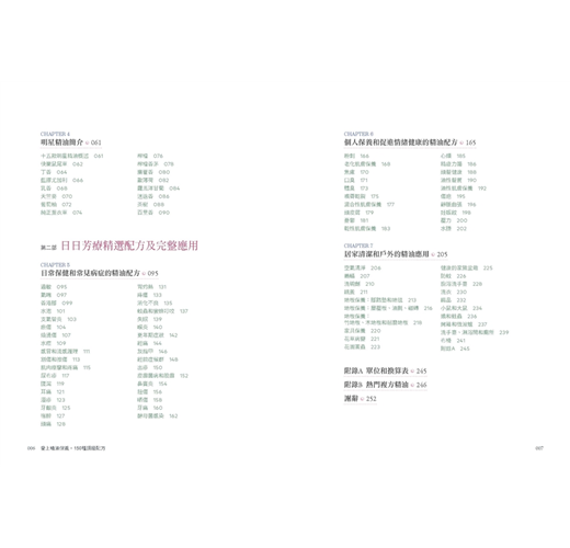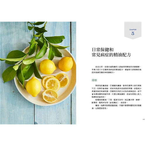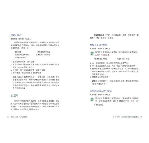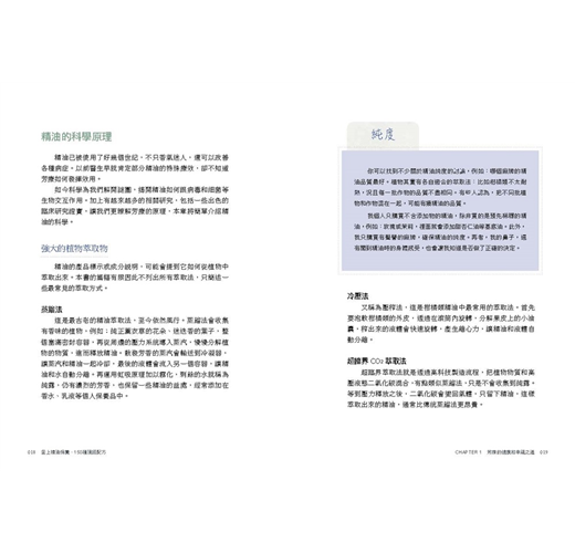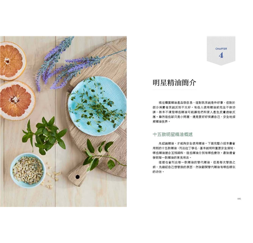 這本書提供很多實例,以淺顯易懂的方式介紹芳療,讓大家認識十五種常見的精油,包括九種「非買不可」的精油(丁香、藍膠尤加利、天竺葵、純正薰衣草、檸檬、檸檬香茅、歐薄荷、迷迭香和茶樹),以及六種「值得購買」的精油(鼠尾草、乳香、葡萄柚、廣藿香、羅馬洋甘菊和百里香),這些精油大多數都在入門精油套組之列。當然你也可以直接買精油擴香,但本書的作法獨樹一格。