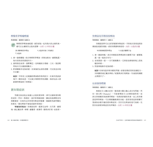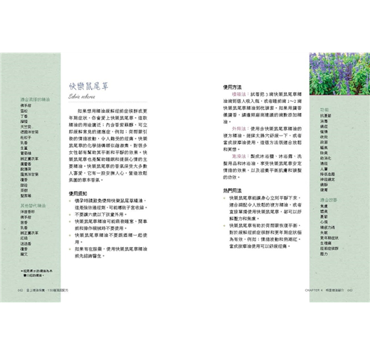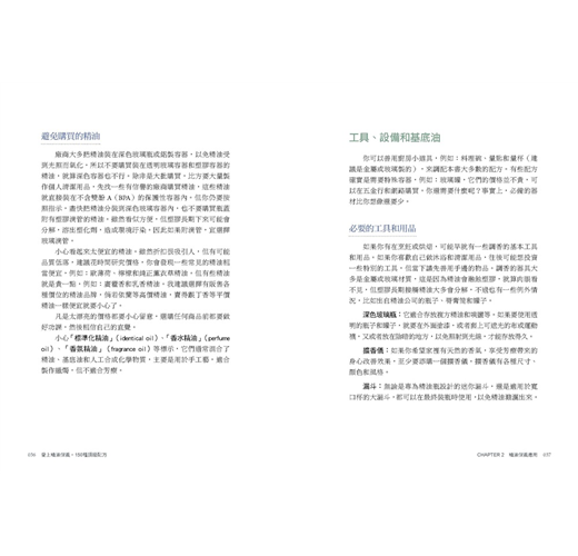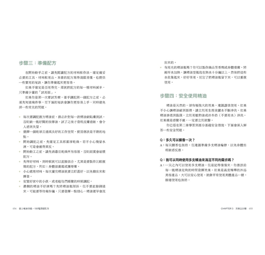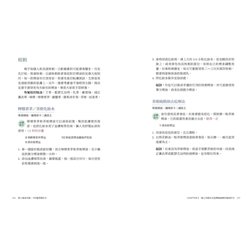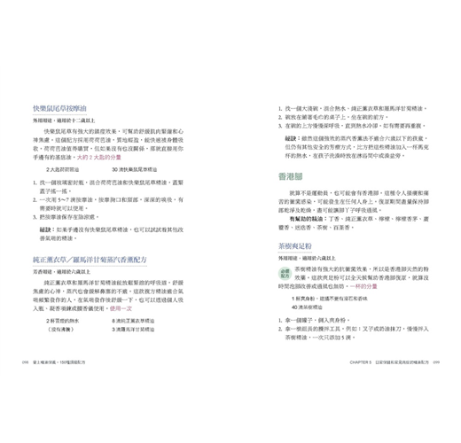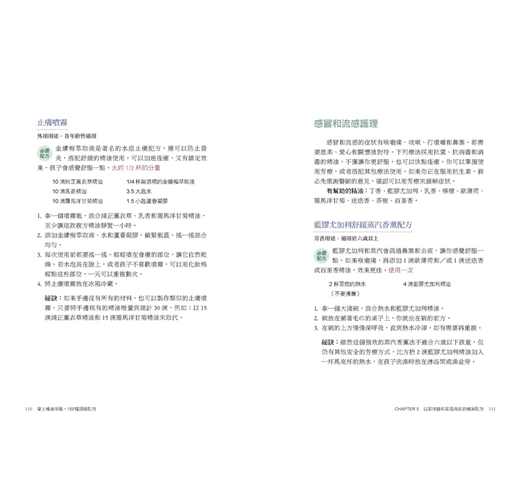 本書收錄10款熱門的複方精油,如幫助消化、呼吸順暢、鎮定、排毒、內在平靜、心情愉悅、澄心、安眠、快速止痛、盜賊配方等,你也能試著自己調配出專屬保養品。