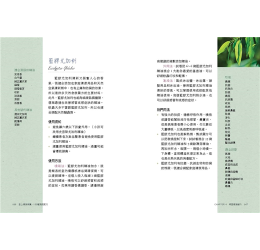善用「精油療癒力」讓生活煥然一新!◆給身心最值得的溫柔呵護精油是流傳千年的保養聖品,科學研究證實精油富含許多珍貴的護膚成分,能發揮卓越的美容作用,同時具有抗菌能力,蘊含強大的修復力量,能幫助加強身體的免疫系統,只需幾滴,就能感受到前所未有的療癒感受,調整身心的失衡狀態。例如:藍膠尤加利精油能幫助抗病毒、祛痰、通暢呼吸道;歐薄荷精油能舒緩消化不良、感冒和頭痛;想要迅速補充體力,可以在入浴時滴幾滴迷迭香精油提振精神等。