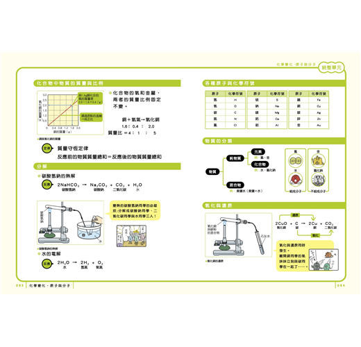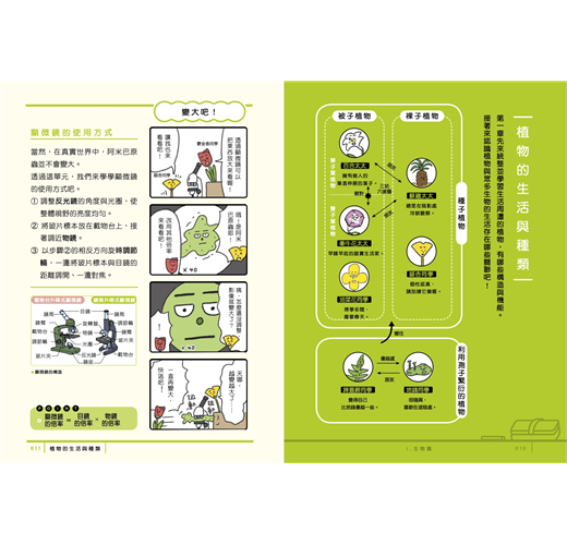 全書將自然學科再分類,學習脈絡分成生物、化學、物理以及地球科學等四大篇章,