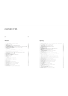 《森林裡的法國食年(收藏冬春)》 冬天Winter 1.栗子填鴨肝肉餡烤雞 Volaille farcie aux châtaignes 2.啤酒濃湯 Soupe de la bière 3.清雞高湯&雞湯塊 Bouillon de volaille&Tube de boullon 4.薯片炸雞腿肉丸搭配BBQ醬 Chips boulettes de cuisse du poulet rôtis et la sauce BBQ 5.根莖蔬菜煮牛肉高湯&高湯番茄醬汁 Pot-de-feu aux légumes oublies 6.奶油花椰菜濃湯 Créme dubarry 7.全雞火鍋& 雞肉飯 & 雞皮高湯奶油醬Poulet-au-pot&Riz du poulet 8.庭院的柔軟蘋果蛋糕 Gâteau aux pommes du jardin 9.兒時記憶中奶奶的巧克力四分之一蛋糕 Quatre-quarts du chocolat d’enfance 10.鼠尾草蜂蜜溫白酒 Vin blanc de sauge 11.新鮮百里香茶&百里香糖漿茶 Thé au thym du sirop 12.長壺梨塔 Tarte Bourdaloue 13.香料溫紅酒 Vin Chaud 14.11天糖漬橙片 Tranches d’orange confites 15.老奶奶的自製苦橙酒 Vin d’orange de mami 16.糖塔 Tarte du sucre 17.蘋果西洋梨軟糖 Pâte de fruits au pomme 18.香料麵包&熱巧克力 Pain d’épices et chocolat chaud 19.肉桂巧克力慕斯 Mousse au chocolat à la cannelle 20.鄉村核桃蛋糕 Gâteau du noix rustique 21.榛果奶酥蘋果泥塔Tarte au pomme et cremble au noisette