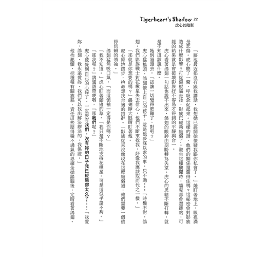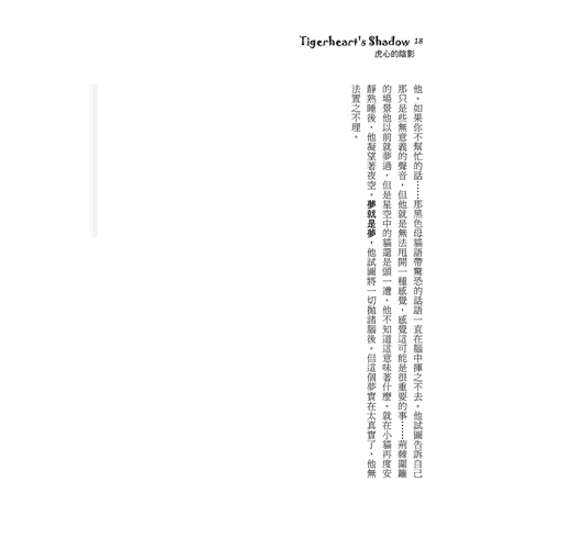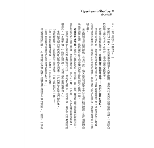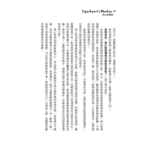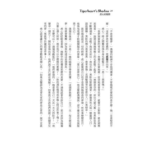 同時間,與雷族戰士鴿翅的愛戀讓虎心難以自拔,使他陷入了部族與摯愛的抉擇之中。為了影族的未來,也為了守護深愛的貓兒,他必須做下決定,即使這意味著他將永遠離開自己的部族……