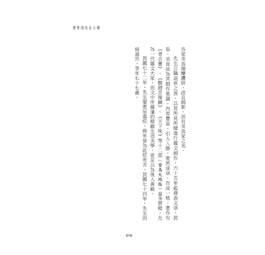 先生公職退休之後,以其所見所聞進行雜文創作,六十五年起發表文章,民俗、美食成為其創作基調,內容豐富,引人入勝,斐然成章,自成一格。著作有《老古董》、《酸甜苦辣鹹》、《大雜燴》、《南北看》、《中國吃》、《什錦拼盤》、《說東道西》、《天下味》、《老鄉親》、《故園情》(上、下)、《唐魯孫談吃》等十二部。量多質精,允為一代雜文大家,而文中所傳達的精緻生活美學,更足以為後人典範。