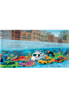 繼續翻頁,使城市人事物「水族化」的不只是文字,在圖畫裡,水面下的一切也是,隨著想像力的力道加強,整座城市變得奇幻無比。不過,將魚線、魚鉤從高樓往下垂釣,當然有潛在的危險,祖孫倆差點惹上麻煩,老老實實將收好釣竿,看起來很落寞,難道故事要在這裡收尾嗎?