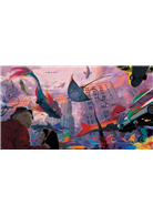 封面上的祖孫,坐在城市高樓的頂端,他們的比例顯得很大,是巨人嗎?還是他們因為心情雀躍,而顯得特別有「存在感」?另外,他們拿著釣竿,正在釣魚,難道城市被大水淹沒,被大自然接管,由水族進駐了嗎?這是一本關切環境議題的作品?