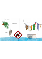 後來她想到一個「假裝」遊戲,於是他們拿起釣竿從空中垂釣,街道是他們的大海,他們釣到好多好多奇妙的魚,首先是會飛的垃圾魚,還有路標魚、計程車魚、巴士石斑魚等,不僅如此,他們打算再往更深的大海挑戰,要釣到最大的魚……