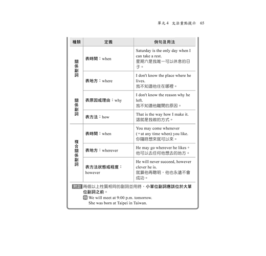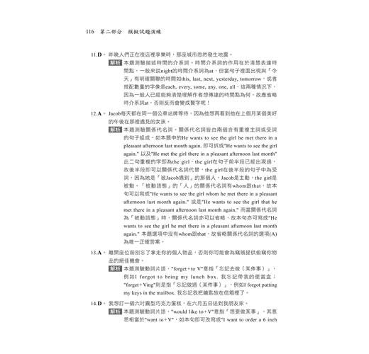 書中的模擬試題解析內容,作者透過淺顯易懂的解說,還有貼心的小提醒,除了解答題目外,也補充許多相關內容,包括容易混淆的文法概念、近義詞、反義詞等,還有基本句型的舉例,以及分享深度記憶的技巧,希望能讓你在學習時,彷彿身邊有位老師,手把手地帶領你走進英文的世界,讓你不再徬徨無助。