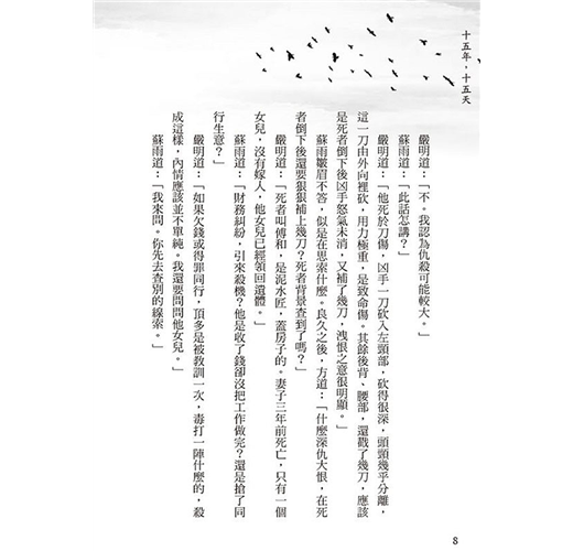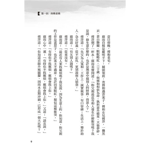 蘇雨道:「最近有人來找麻煩嗎?我是說,因為生意上的。妳知道,妳父親的工作是蓋房子,也許案主不滿意,也許同業眼紅,類似這種衝突。」