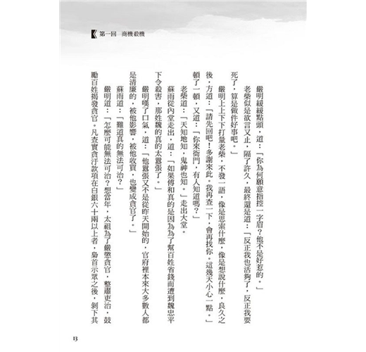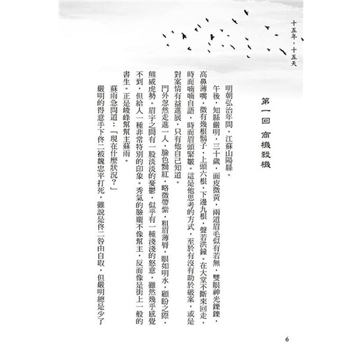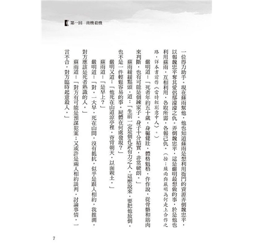 午後,知縣嚴明,三十歲,面皮微黃,兩道眉毛似有若無,雙眼神光鑠鑠,高鼻薄嘴,微有幾根鬍子,上頭六根,下邊九根,聲若洪鐘。在大堂不斷來回走,時而喃喃自語,時而眉頭緊皺。這是他思考的方式,至於有沒有助於破案,或是對案情進展有益,只有他自己知道。