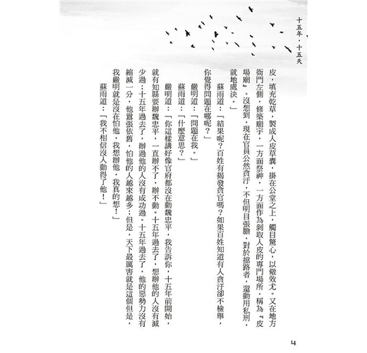 嚴明道:「你這樣講好像官府都沒在動魏忠平,我告訴你,十五年前開始,就有知縣要辦魏忠平,一直辦不了,辦不動。十五年過去了,想辦他的人沒有減少過;十五年過去了,辦過他的人沒有成功過。十五年過去了,他的惡勢力沒有縮減一分,他囂張依舊,怕他的人越來越多;但是,天下最厲害就是這個但是,我嚴明就是沒在怕他,我想辦他,我真的想!」