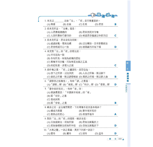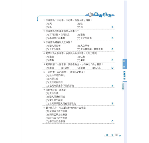 【適用對象】這本《國文完全攻略》適用於報考公務人員初等及地方特考五等考試的考生。【本書介紹】國文被各大公職考試列為共同科目,但其內容「浩瀚無邊」的特性也讓許多考生頭痛不已!考生的心聲,三民輔考的老師都知道,國文絕對不能忽視或輕言放棄,因為只要跟著我們按部就班,它很可能就是你在各大公職考試中金榜題名的關鍵!本書由三民專業名師群針對公職五等考試國文命題趨勢精心彙編,共分以下主題:第一部分 字音字形辨正:精選常考易混淆字音250字+易混淆字形500字+字音字形綜合測驗100題,幫考生治療音形不分的症狀。第二部分 重要修辭及應用文知識:根據大量考古題出現之成語,依主題分類,並附成語解釋,易懂易讀。還專頁收錄命題委員很愛考的年紀之成語。各類題辭分門別類,一起記憶,事半功倍。背完再練習後附的成語綜合測驗100題,淬鍊硬實力。另收錄讓上萬考生頭痛不已的書信結構用語,這些古人信件用詞偶爾會被命題,但因範圍有限,作者已將之濃縮表格化成三頁內容,有背考出來就立馬拿分。第三部分 國學常識:幫考生歸納整理從先秦到清代的各家學說流派及著名作家,並以簡單易記表格呈現,讓國學常識不再艱澀難背。第四部分 閱讀測驗:收錄多篇先秦到清代的著名文章,篇篇語譯,大幅提升考生閱讀理解能力。第五部分 公文格式:詳細介紹公文基本格式,提示撰寫要點,並將重要公文用語以表格呈現,簡單易懂。書末收錄106年~109年初考及鐵路特考佐級國文考科試題共9份,並由三民補習班名師群題題做詳細解析,幫助考生快速熟悉命題方向、輕鬆破解考題!【試題分析】近年來公務人員初等考試的國文考科當中,測驗題型主要分為單選題及複選題兩個大題。整體而言,初考國文科題目難度中等,出題方向較為著重基本知識與閱讀理解,少有特別刁鑽偏門的題型,因此只要事前準備充分,就能穩紮穩打拿下分數。單選題除了公文格式用語外,各主題中以閱讀測驗比重較高,題幹常會有一至數行引文,應考時務必耐心閱讀題幹,仔細看清題目問的是什麼。複選題是難度較高的題型,因為不確定每一題的正確答案有幾個,因此一定要仔細把每一個選項看完,並找出其中不正確的部份再予以刪去,留下的便是正確答案。初考國文科考題內容大致可分為下列幾個類型:(一)國字辨正:通常每份試卷會有1至2題這樣的題目。其考法大多為辨別同個字在不同文句中的意義,或解釋詞語中單個字的字義。由於文字考題範圍廣泛,比較考驗考生的基本功。(二)國學常識:本項目涵蓋文學史、作家知識、諸子學說、文學體裁等各種範圍。近年來國學常識已很少單獨出一些細節題型,因此準備時不必太過考究細節,大致記憶各項重點即可。(三)閱讀測驗:此類題目是每年考題中最重要的題型,總占比約全部試題的三分之二。閱讀理解題型即出一段文句,來測驗考生對引文「文意的理解」。文章的來源十分廣泛,從先秦古文一直到近代白話文都有可能出題。所選文章也不限文體,每份試卷幾乎皆有散文、韻文入題,亦常混合其他主題一起出題。這種題型並沒有範圍能夠準備,完全考驗考生閱讀理解的程度,也是奪得高分的必爭之地。(四)詞語理解:此類題目是初考考題中占比次高的題目。考生除了需要辨析常見成語、題辭等的意義和使用原則,還要理解稱謂、書信用語等詞語的正確使用場合。本類題目在單、複選題皆可能出現,非常要求詞語使用的正確性。(五)語法修辭:此類題目占比不高,只要對各種修辭的定義與例子有基本理解,大部分可以按文意判斷。(六)公文用語:此類題目為初等考試必考,題數約3題左右。由於完全屬於記憶式題目,考生務必熟讀現行的公文格式條例,一定要取得這部分的分數。(七)複選題:本部分屬於複選題型,意即正確答案不只一個,因此作答時一定要把所有的選項都仔細看完,不可看到覺得對的答案就直接作答。初考複選題計分有倒扣,最多扣至該小題分數為0,不會影響其他題的分數,因此碰到少數選項沒有把握的題目,建議還是盡量作答,不要整題留白,失去得分機會。【考生上榜心得:地特五等 一般行政】上榜生:田佩晨國文:81.6分公民與英文:88分法學大意:86分行政學大意:84分我先前從事的行業是安親班老師,當時會選擇參加考試的主要原因是因為求職不容易,且薪水與工作量截然不成正比。但反觀公職除了工作穩定外,福利也比一般企業好很多,因此選擇踏上準備公職的道路。三民老師非常用心與耐心,雲端+面授雙效課程超有效選擇三民是因為我之前在三民有參加過證照班的課程,對三民的印象很好,這次準備公職依然選擇三民,而且三民提供「雲端+面授」的雙效課程,幫助我在上課前預習,下課後複習更快熟悉內容,加上平時班導師都會定期安排小考進度,讓我更能夠檢視不熟悉的部分以便加強。班導師課後也會不斷叮嚀同學記得複習跟小考訂正及筆記的整理,多管齊下讓我不會輕易鬆懈休息,努力的往前走。三民多位輔導老師也常鼓勵我,甚至很看好我,這也成為我努力的動機,不想讓大家失望!還有三民輔考佩伶老師的勉勵,支持我走到今日,佩伶老師充滿耐心和愛心,經常聽我抱怨訴苦,非常感謝她的精神支持。不要輕易放棄,勇敢地努力向前衝刺考生是非常容易胡思亂想的,其實每個人都會遭遇挫折或瓶頸,甚至會遇到高分落榜的情形,而此時