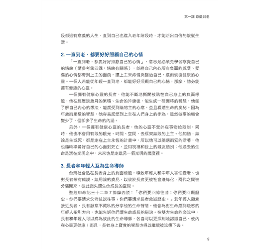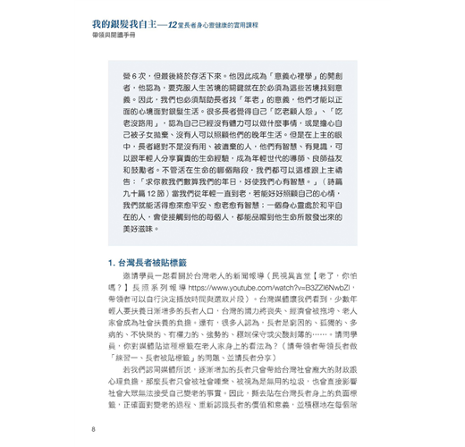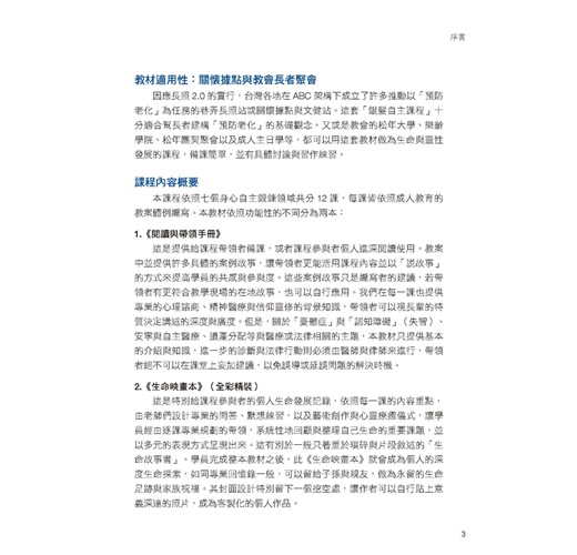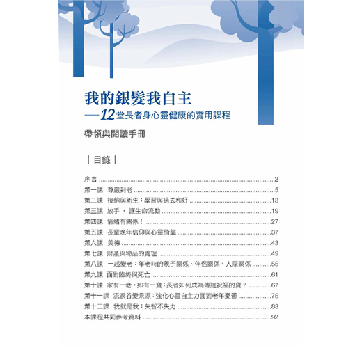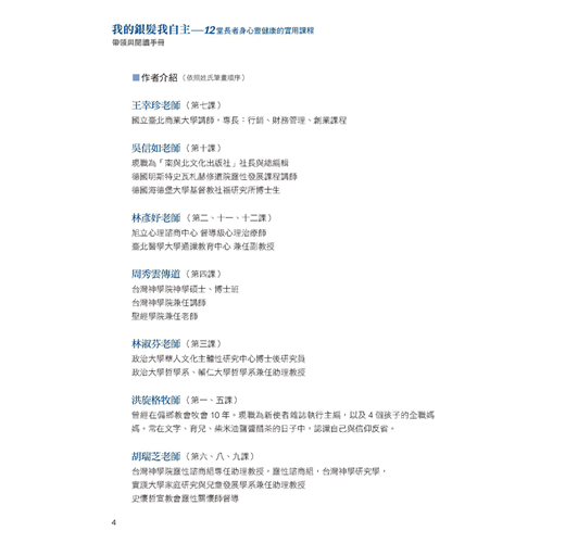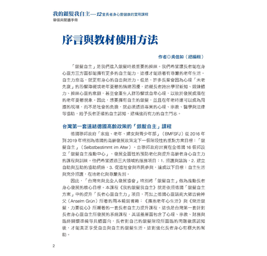 台灣第一個依照德國政府「高齡自主方案」(Selbstbestimmt im Alter)所設計的實務體驗課程。再加上德國心靈諮商大師古倫神父(Anselm Grün)所著的兩本暢銷書籍:《擁抱老年心生活》與《樂活銀髮,力要從心》所編著。