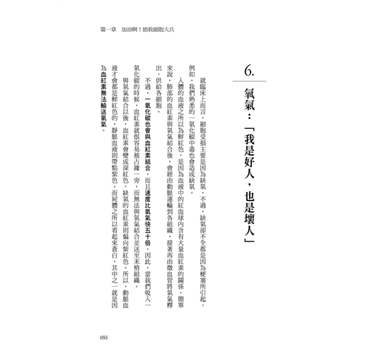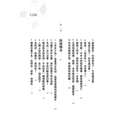 回歸正傳吧。本書除了序章以外,由五個章節所組成。第一章的「加油啊!搶救細胞大兵─從損傷、適應,到死亡」,介紹細胞在受到各種刺激時,怎麼適應,以及在何種狀況下會掛點。第二章的「血液傳奇─頭暈、貧血、血栓、缺氧,如何找對症狀?」,鎖定心血管障礙,說明這個與癌症不相上下,占日本人死因25%的疾病(按:據世界衛生組織公布,2020年全球的死亡頭號殺手就是心血管疾病;根據臺灣衛福部2018年的死因統計,心腦血管相關疾病其死亡人數高達四萬八千四百五十四人)。此外,還跟大家說一說貧血,這個致死率不高卻常見的疾病。