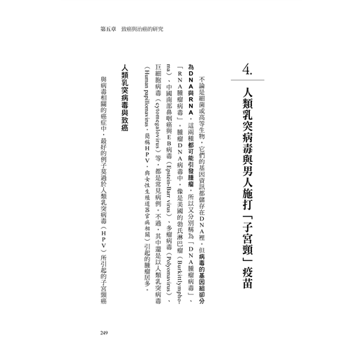 第四章與第五章談到癌症。第四章可以說是總論的基礎篇,說明癌症發病的原因。第五章比較傾向各論的應用篇,也就是配合第四章的內容進一步說明子宮頸癌、胃癌或肝癌等亞洲人常見的癌症。