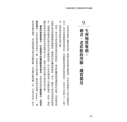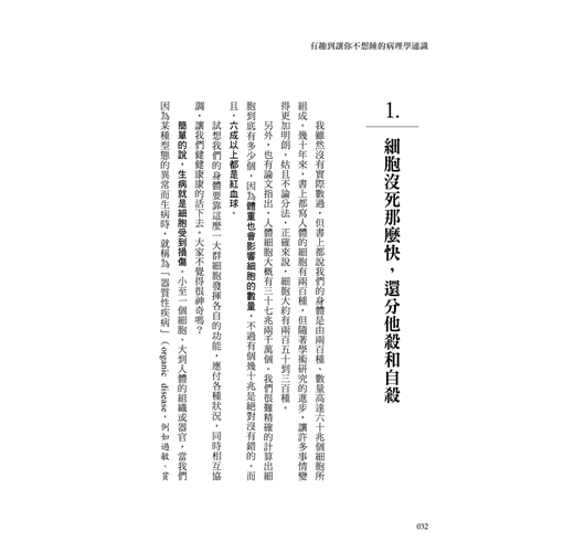 本書則是從八章的總論中挑出「細胞的損傷、適應與死亡」、「血流動力學異常、血栓與休克」與「腫瘤」分成三個章節。其實,我也想把所有內容都納入,不過我擔心這樣一來會變成走馬看花,反而不知所云。所以,我才會選擇最重要的三個章節作為本書的內容。這本書如果反應不錯,有幸受到讀者青睞的話,那麼我就有機會推出續集,所以懇請各位多多支持與鼓勵。
