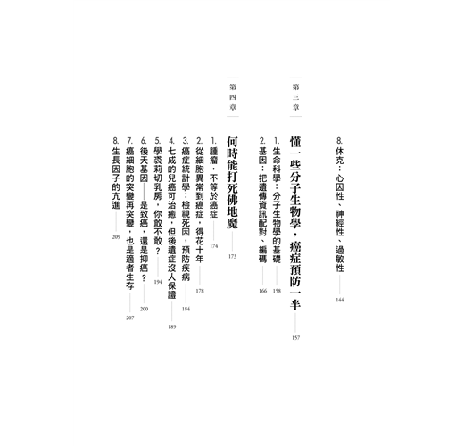 接下來的第三章,則是介紹分子生物學的基礎,以銜接後面章節的惡性腫瘤與癌症。對於已經有所涉獵的讀者而言,這個部分讀起來可能有點像教科書。不過,為了讓一般讀者也能夠順利讀下去,因此我特地將艱澀難懂的內容壓縮到最低,盡可能深入簡出的為大家說明。