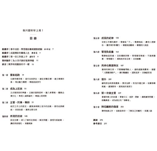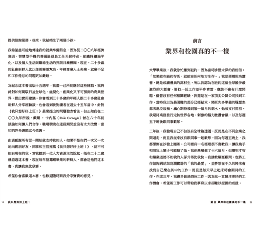 「對新鮮人來說,拿到理想工作只是第一步,如何在入職後強化自身發展,權衡應對進退,才是真正的挑戰。本書不僅囊括職場禮儀、人脈經營,更重要的是也談到了「以自己為出發點經營職涯」的思維。相信本書能幫助新鮮人在職涯早期建立正確心智,以切實態度更好適應於職場中。」──蓋洛普認證優勢教練暨職涯教練・《但願你因工作而閃亮》作者 林沂萱