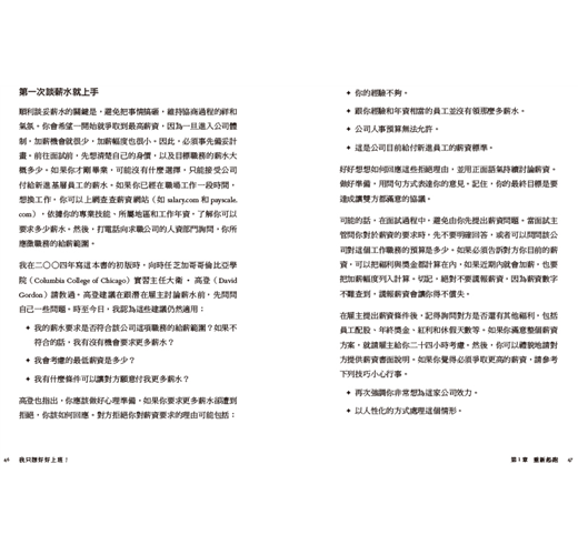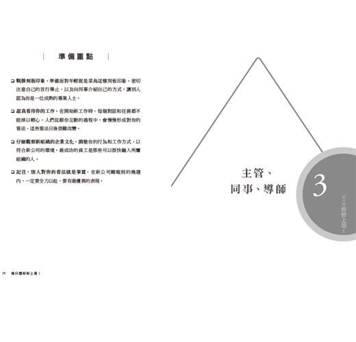 在職場,沒有人有義務要了解你。賴維特從自己與20年的顧問經驗,打開社會新鮮人不知道該注意的盲點,了解衣著、應對、準備資料等每個小舉動,如何影響同事、主管對你的想法。她按照職涯的進程,從找工作、上班到轉職,列出每個階段該有的準備,以及不同情境下可以有的實際應對心態與技巧,都是學校老師不知道、同儕學長姐也不會告訴你,但是你非常需要知道的職場闖關小撇步,包括: