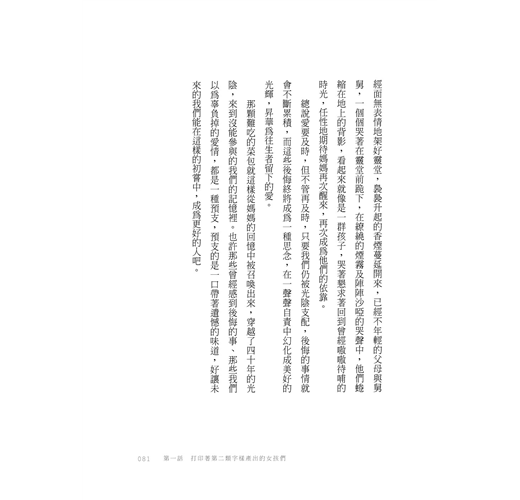 作者的文字像一面面磨亮的鏡子,你第一次在反射裡讀到自己眼中的恐懼,你才知道,那確實是傷。跟著回顧自己的童年、職場生涯、性別角色,甚至國族定位,字裡行間的痛快之外,過去的自己,彷彿也獲得了釋放。