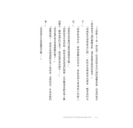 小時候,這些心靈的刮傷習以為常,甚至不曾懷疑它是一道傷。直到近年來,市面上陸續出現的親子教養書,以及作者的文字,都像一面面磨亮的鏡子,你第一次在反射裡讀到自己眼中的恐懼,你才知道,那確實是傷。